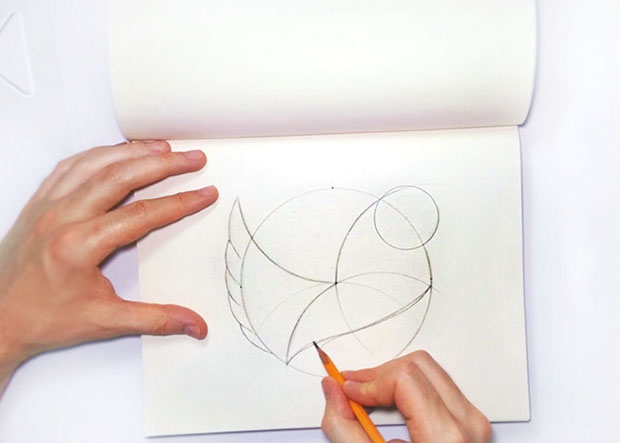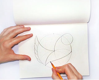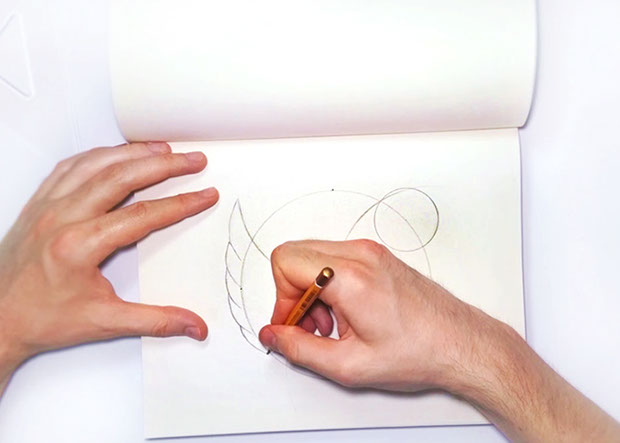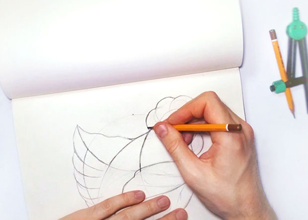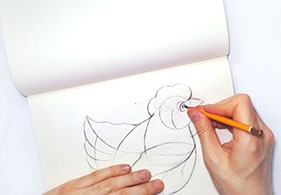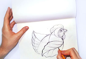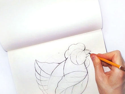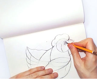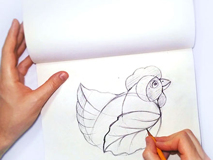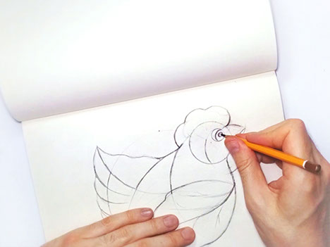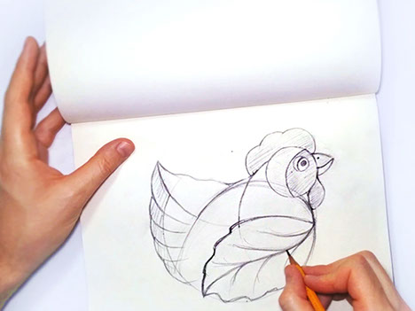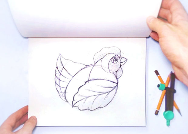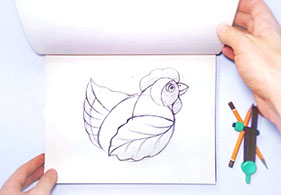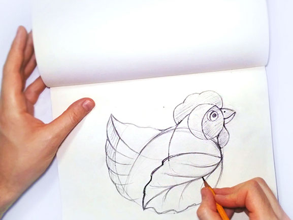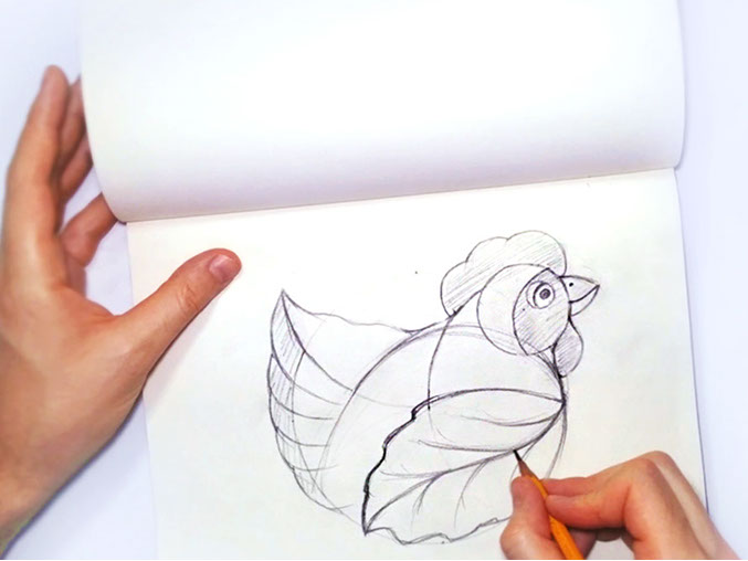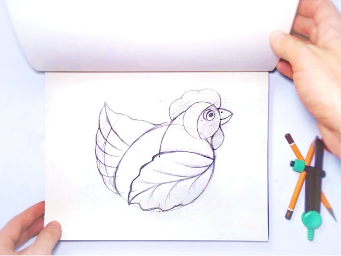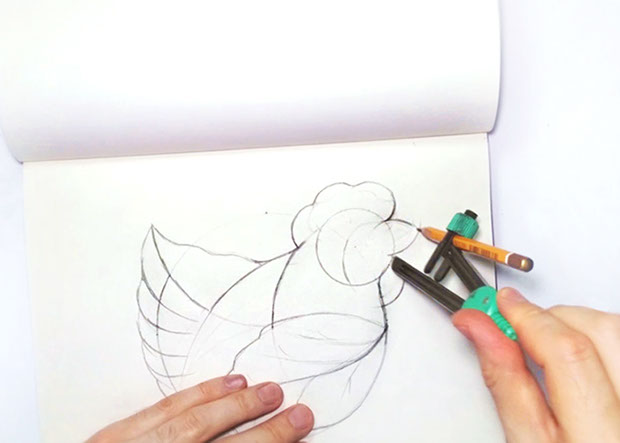 Draw a circle for the head by placing the compasses on the contour of the circle and then drawing a contour of the tail of the chicken by the flowing lines.