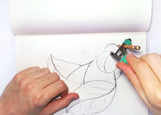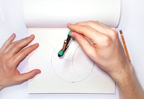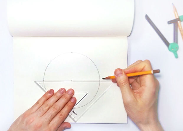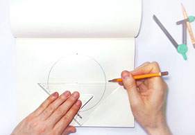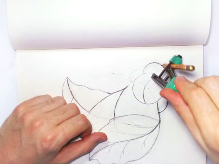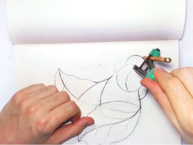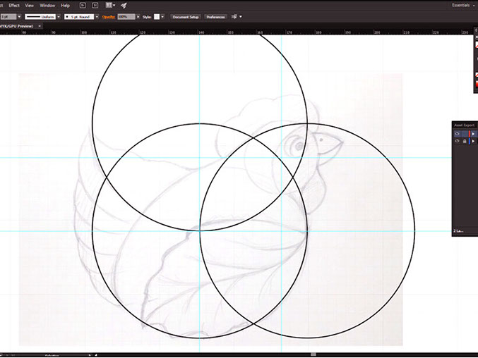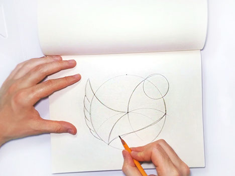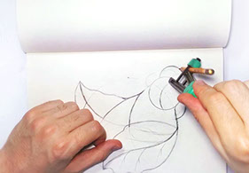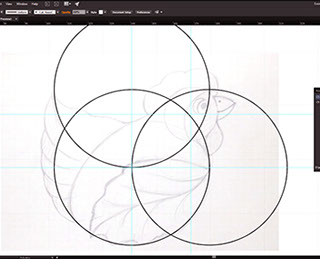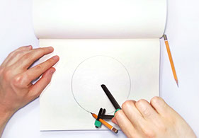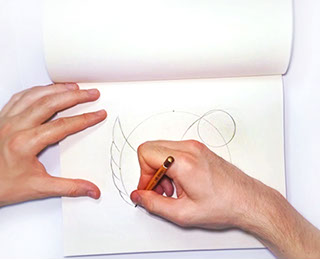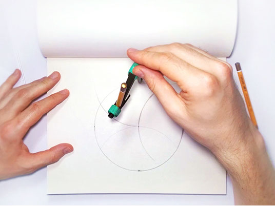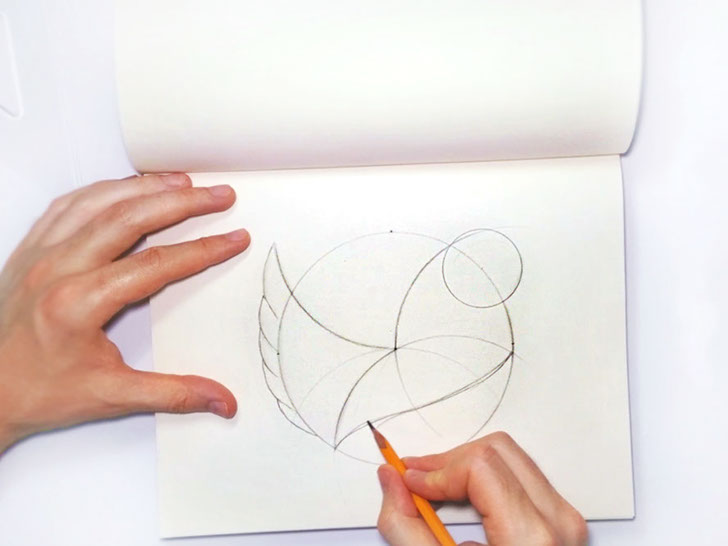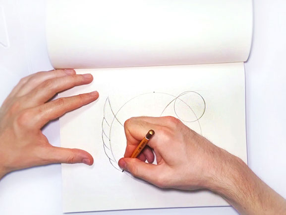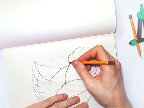 Draw a circle for the head by placing the compasses on the contour of the circle and then drawing a contour of the tail of the chicken by the flowing lines.