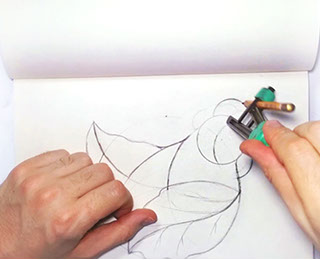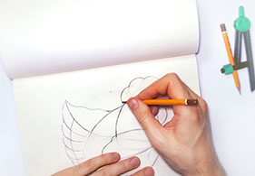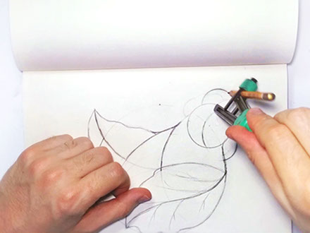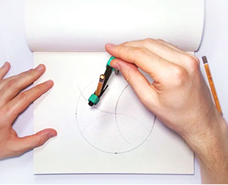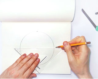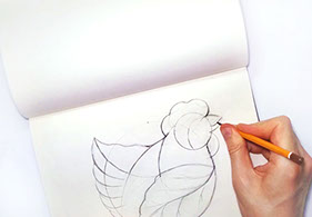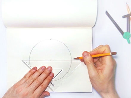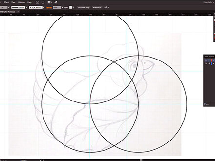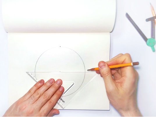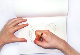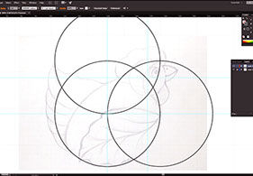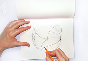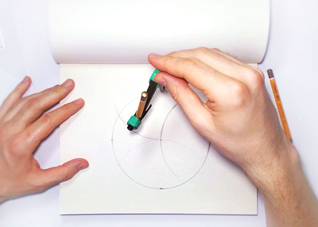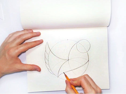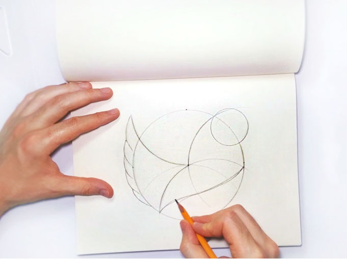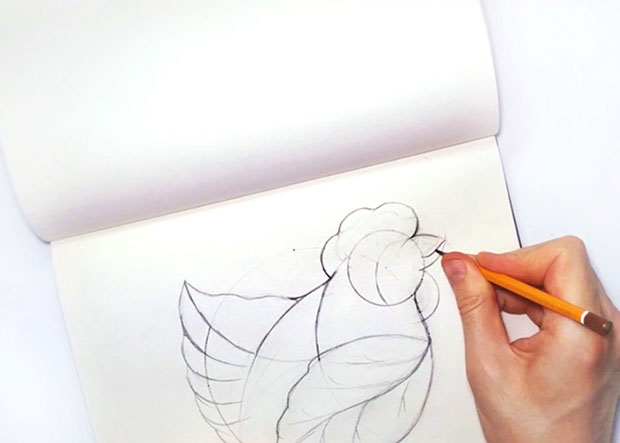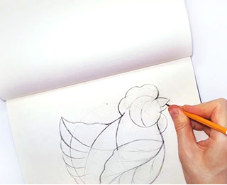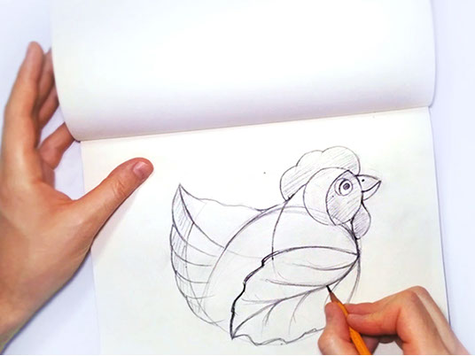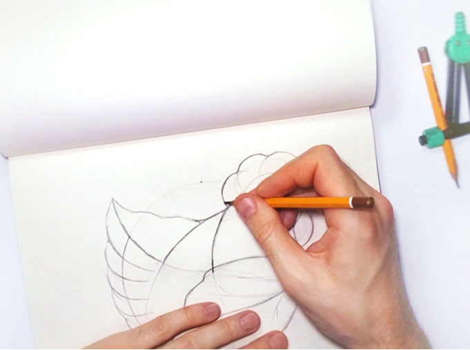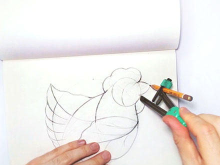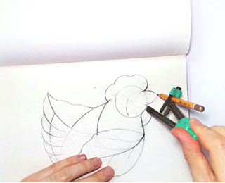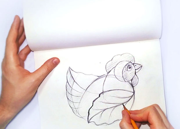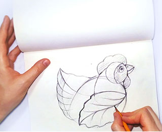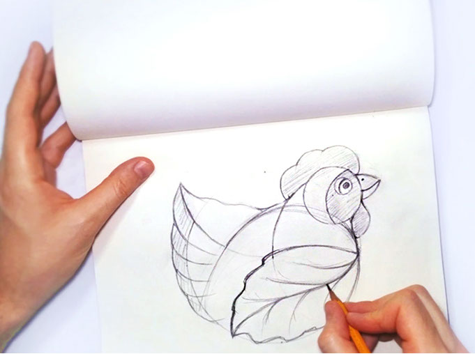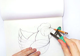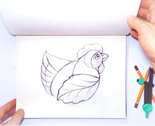 Draw a circle for the head by placing the compasses on the contour of the circle and then drawing a contour of the tail of the chicken by the flowing lines.